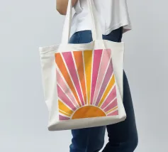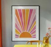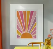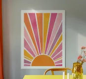 Cette illustration moderne et vibrante présente un magnifique soleil stylisé, dont les rayons étendent des teintes chaleureuses et douces de rose, orange et violet. L'agencement géométrique crée une sensation de calme et d'optimisme, parfait pour apporter une touche de chaleur et de positivité à n'importe quel espace. Ce design abstrait évoque un lever de soleil, symbolisant un nouveau départ, et est idéal pour égayer votre intérieur avec une touche de couleur contemporaine et apaisante.