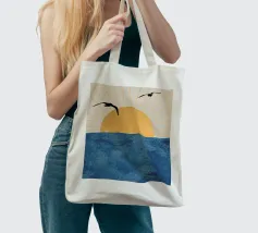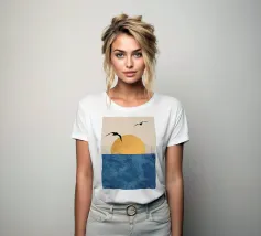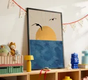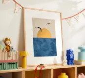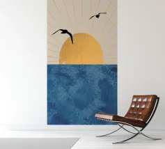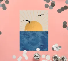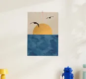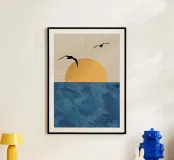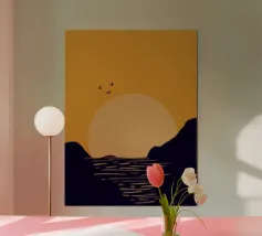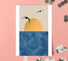 This poster captures the essence of calm with a minimalist sunset (or sunrise) over the ocean. The textured golden circle and silhouetted seagulls create a retro and refined atmosphere. It is perfect for bringing a feeling of vacation or relaxation into a bedroom, living room, or bathroom. Nature art paint, sun art, ocean view, nature wall art