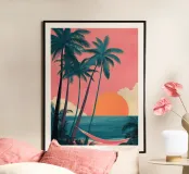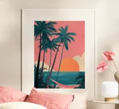 Transform your space with the "Sunset Hammock" poster, featuring vibrant shades of pink and orange, perfect for adding a calming tropical vibe to your living room or bedroom. This stunning artwork evokes relaxation and wanderlust, making it an ideal piece for anyone who loves beach and tropical aesthetics.