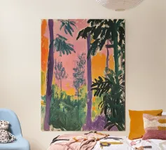 "Sunset Jungle Path" is a vibrant, abstract landscape that captures the warmth and energy of a tropical jungle at dusk. Bold, expressive brushstrokes in rich greens, pinks, and yellows lead the viewer down a winding path, while the setting sun—a glowing red orb—adds a touch of mystique to the scene. The playful use of colors and shapes evokes a sense of adventure and tranquility, making this artwork perfect for adding a lively, exotic atmosphere to any space. Designed by BALIKA HOMES.