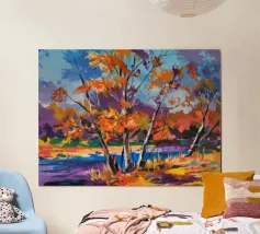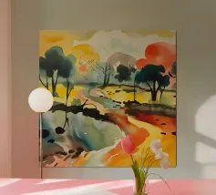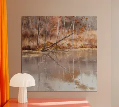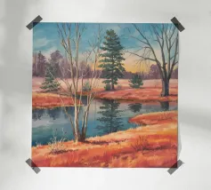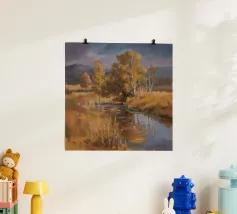 This painting captures a sunset over a marshy landscape, with reflections in the water. The warm hues and tranquil setting evoke a sense of calm and beauty.