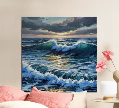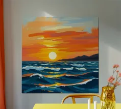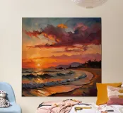 The sky, ablaze with hues of crimson, lavender, and deepening blue, reflects softly upon the water’s surface. A warm breeze carries the scent of salt and distant shores, while seagulls glide silently against the glowing sky. In this fleeting moment, the world holds its breath—bathed in the quiet majesty of a sunset over the ocean.
