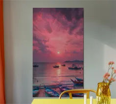 The ocean reflects this brilliance, its surface shimmering like liquid fire. Gentle waves roll in rhythmically, catching the light with every crest. The air is calm, filled with the soothing sound of water and the scent of salt. In this magical moment, the boundary between sea and sky seems to disappear, leaving only the beauty of the sunset over the endless ocean.