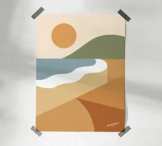 A bold, minimalist composition capturing the essence of a summer sunset with stylized geometry. Set in warm peach and golden hues above the soft gradient of teal waves, the scene balances warmth and coolness with perfect harmony. This artwork blends the nostalgic calm of beach evenings with a modern flat aesthetic, ideal for contemporary interior décor or summer-themed collections.