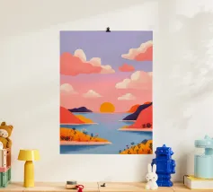 This vibrant abstract artwork captures the breathtaking beauty of a sunset over a calm lake. The geometric shapes and bold colors create a sense of awe and wonder, inviting the viewer to immerse themselves in the peaceful scene. The reflection of the fiery sky on the water's surface adds depth and tranquility to the composition.