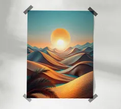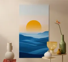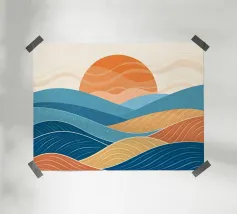 A mesmerizing abstract seascape depicting a sun setting over undulating, flowing waves. The vibrant orange hues blend seamlessly with cool blues, creating a breathtaking and serene atmosphere.