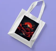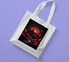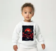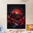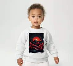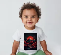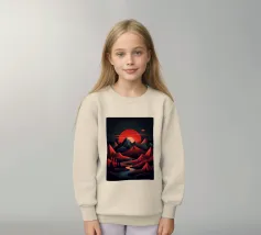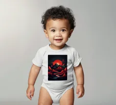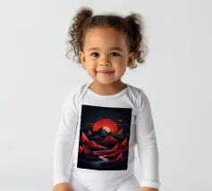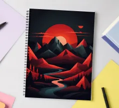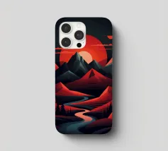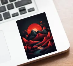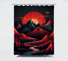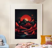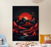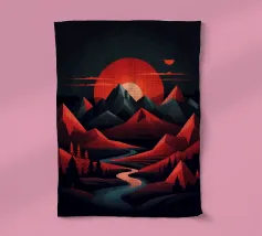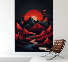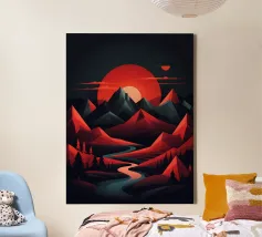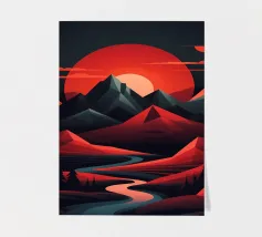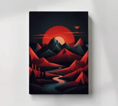 This geometric landscape showcases a dramatic sunset casting a warm glow over a majestic mountain range. The minimalist style emphasizes the bold shapes and vibrant colors, creating a visually striking and modern piece. The winding river adds a sense of depth and dynamism to the composition.