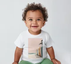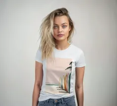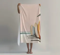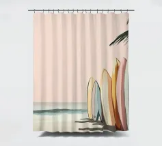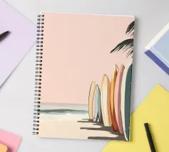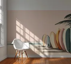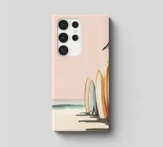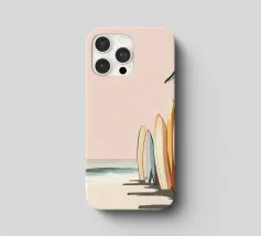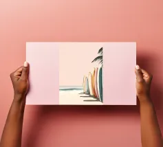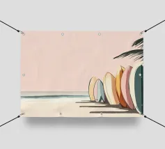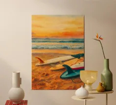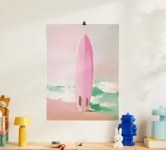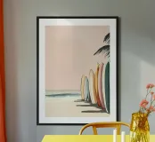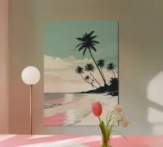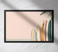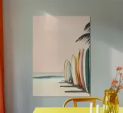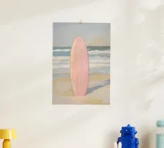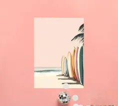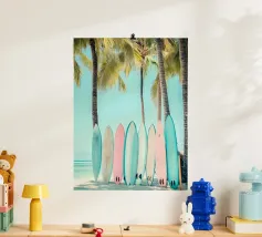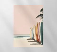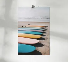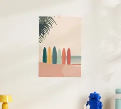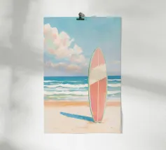 Escape to a serene coastline with this beautiful "Surfboards on the Beach" poster. The artwork features a row of vintage surfboards leaning on a palm tree, set against a calm ocean and a soft, pastel sky. The muted color palette and retro aesthetic evoke a sense of peace and nostalgia for summer days by the sea. This high-quality digital print (7000x5000 pixels, 300 dpi) ensures every detail and subtle color variation is beautifully captured, making it a perfect addition to a living room, bedroom, or surf-themed space.