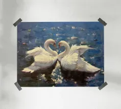 This oil painting does not merely depict a swan, but rather captures a sense of elegance and purity. The swan glides gracefully across the still lake, like a princess from a fairytale. The golden hues of dawn bathe the water's surface, creating a romantic and poetic atmosphere. The painting evokes a sense of serenity, softness, and a dreamlike feeling when beholding the beauty of nature. Its snowy white feathers contrast beautifully with the blue of the lake, composing a harmonious symphony of color and emotion.
