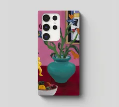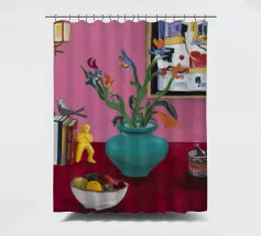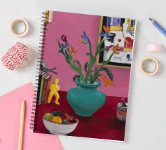 A charming scene unfolds with a teal vase holding a colorful bouquet of flowers, alongside neatly stacked books and small figurines, on a pink table against a pink wall with a window.