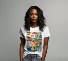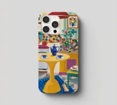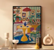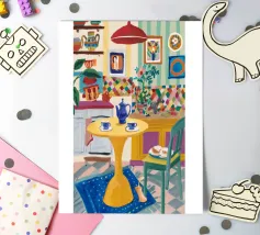 A vibrant patchwork kitchen with yellow table, tea set, and art bursts with domestic color.
