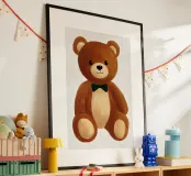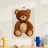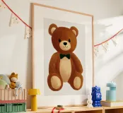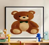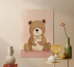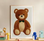 The picture shows a lovingly drawn teddy bear illustration with soft, brown fur and beige-coloured accents on the snout, tummy and feet. The bear wears a dark green bow tie and looks out into the world with round black eyes. The style is classic and nostalgic, with a warm, textured background surface reminiscent of wood or canvas. It radiates a sense of security and childlike light-heartedness.