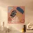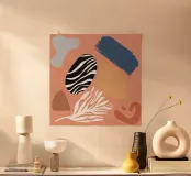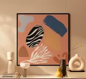 A contemporary abstract artwork combining different textures and shapes. A bold, blue brushstroke contrasts with a zebra patterned oval and soft, organic leaf shapes, creating a dynamic and tactile composition.