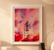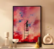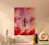 Elevate your space with the Cloud Painter artwork, featuring a whimsical scene of a child atop a ladder, immersed in the act of creating or altering the vibrant clouds in the sky. This design captures the essence of creativity and the limitless bounds of imagination. It's a perfect enhancement for an artist's studio, children's room, or any area where inspiration and dreamlike wonder are desired. Each brushstroke in the sky blends hues of pink, red, and blue, crafting a colorful canopy that breathes life and movement into your room.