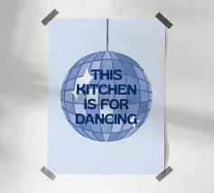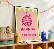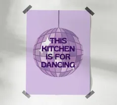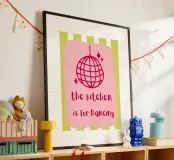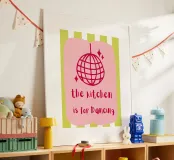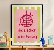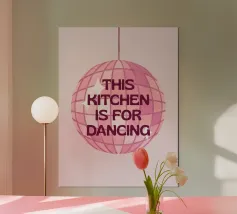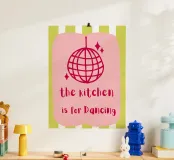 A playful design features a pink disco ball and the phrase "the kitchen is for Dancing" on a pink background. Lime green and white stripes add a vibrant touch.