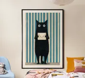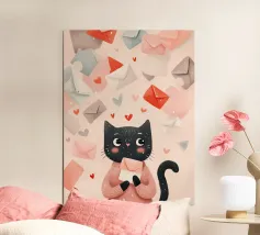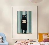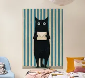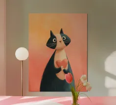 This artwork explores quiet anticipation through a restrained, painterly visual language. A solitary black cat stands upright, holding an envelope as both object and symbol—suggesting communication, secrecy, and unspoken intention. The vertical striped background establishes rhythm and structure, contrasting with the organic, textured fur rendered in deliberate brushstrokes. The wide, circular eyes act as emotional anchors, creating a subtle tension between innocence and gravity. The composition balances minimalism with narrative depth, inviting interpretation through form, texture, and negati
