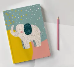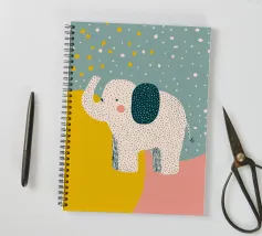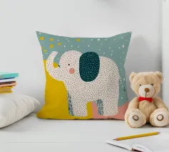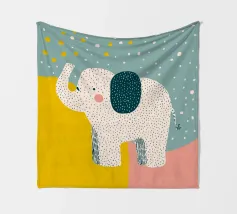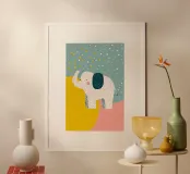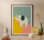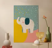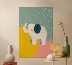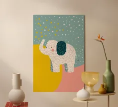 A whimsical and playful illustration of a minimalist elephant brought to life with dotted textures and bold color blocks. This charming composition blends modern flat design with childlike imagination, making it a perfect fit for both nursery decor and stylish, eclectic interiors. Let this joyful little creature bring color and curiosity to your wall.
