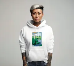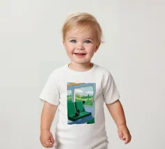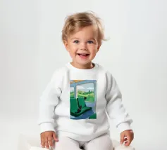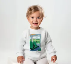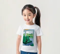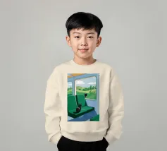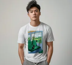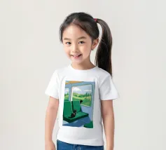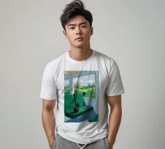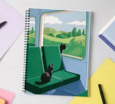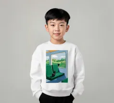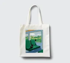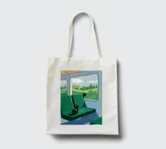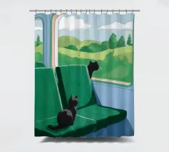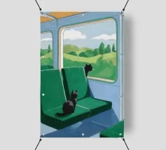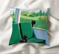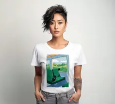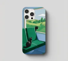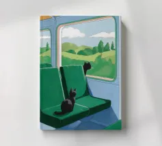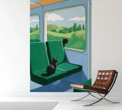 A view from a train window of a green, rolling countryside landscape. The scene is a peaceful, contemplative, and beautiful depiction of travel and the quiet joy of watching the world go by.