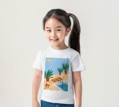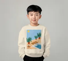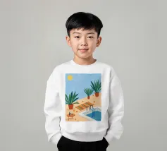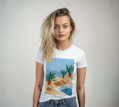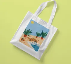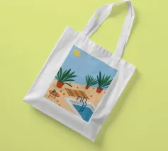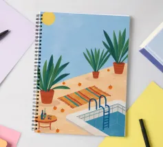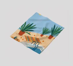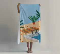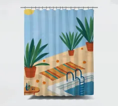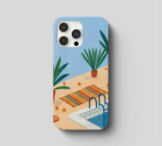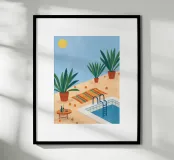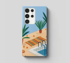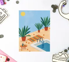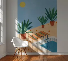 A serene scene of a peaceful poolside with lounge chairs, lush potted plants, and calm blue water under a sunny sky. The illustration is a perfect depiction of a tranquil, private oasis.