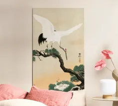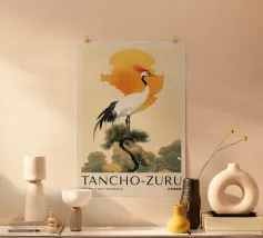A poised crane stands on slender legs against a subtly textured parchment background, its ink-wash plumage rendered in delicate charcoal strokes. The bright red crown and fine calligraphic characters evoke classical East Asian scroll art. Printed on premium archival matte paper, every feather line and tonal nuance remains vivid over time. Ideal for entryways, dining rooms or meditation corners, this elegant print brings serene balance, cultural heritage and timeless grace to modern interiors.