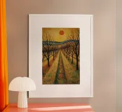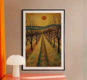 Treelined pathway with red sun over fields and bare trees poster
