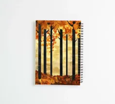 A stunning abstract depiction of an autumn forest with tall, dark tree trunks and golden foliage. The warm, glowing background enhances the geometric composition, creating a serene yet modern atmosphere.