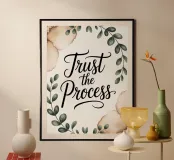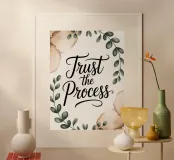 A quiet reminder to move forward with faith. This minimalist botanical print features the powerful phrase “Trust the Process” in elegant script, surrounded by soft watercolor leaves. A calming addition to any mindful space.