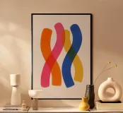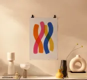Bright colours in flowing movement: This modern art poster shows intertwined, ribbon-like shapes in pink, orange, yellow and blue. The curved composition creates a dynamic balance and visual depth through overlapping transparencies. Perfect for creative spaces, modern interiors and colourful walls with a design focus.
