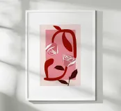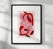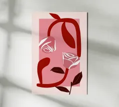 This work immediately captures the viewer with its minimalist sensuality. The bold reduction to strong red and delicate pink tones, held in a rectangular frame, Art Deco meets the emotional depth of Surrealism. The elegantly curved lines form an abstract, almost melancholic feminine face, whose eyes are replaced by stylised, glowing roses. It is a fascinating homage to feminine grace and vulnerability. A light statement for any modern collection that only becomes profound at second glance.
