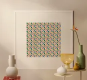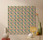 A colorful, repeating pattern consists of abstract shapes in hues of green, yellow, blue, and red. Each element forms a geometric arrangement that creates a vibrant, rhythmic visual effect.