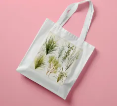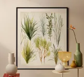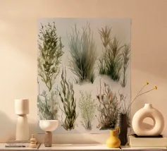 A refined botanical watercolor study of various grasses, reeds, and foliage, depicted in earthy greens and soft golds. Each plant form is uniquely detailed, flowing with rhythm and grace. Sophia Calder’s piece celebrates the quiet elegance and organic geometry of nature’s green architecture.