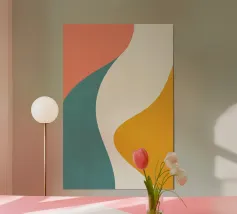 Discover the modern abstract wooden framed art print 'Waves 01' featuring organic shapes in deep navy, orange and pastel hues. This stylish wall art adds a contemporary touch to living rooms, offices or bedrooms. Printed on high-quality textured paper with durable wooden frame, it complements minimalist, Scandinavian and modern interiors. A great choice for art lovers seeking vibrant visual interest without personalization.