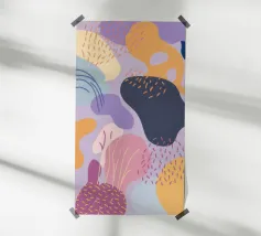 An abstract pattern of wavy, flowing lines in shades of pink, purple, and orange creates a dynamic and visually engaging design with a sense of fluid movement.