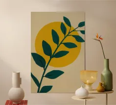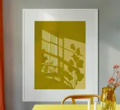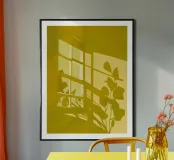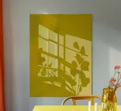 An abstract and minimalist composition focusing on the shadows of leaves cast by a window onto a bright yellow wall. The image is a beautiful and serene study of light, shadow, and form.