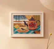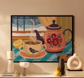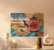 A cozy winter scene viewed from indoors, showing a teapot, a cup with a bird pattern, and a lemon slice on a windowsill looking out onto a snowy landscape.