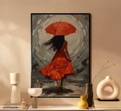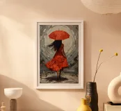 Woman in Red Dress with Umbrella Against Abstract Background poster