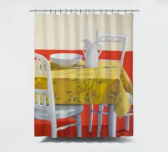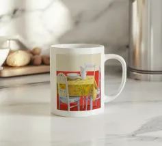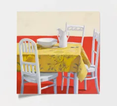 A simple, classic still life of a dining table with a yellow tablecloth, set with a plate and a pitcher. The composition is a serene, minimalist, and beautifully understated depiction of a waiting meal.