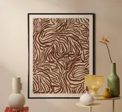 An abstract pattern resembling zebra stripes with irregular brown lines on a beige background. The design has an organic flow.