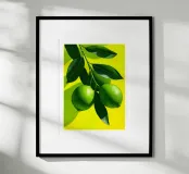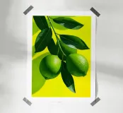 A vivid lime trio hangs from a glossy leafed branch against a radiant yellow backdrop. Crisp highlights and a subtle paper texture create a fresh modern look that pops in kitchens dining rooms cafés and bars. Bold citrus color energizes the space while the clean composition keeps it minimalist and stylish. Ideal for kitchen wall art citrus poster lovers and contemporary interiors.