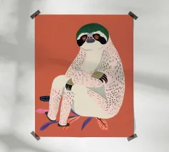 A painted sloth appears on a pink background with a relaxed pose, hanging from a branch. Its distinct facial features are emphasized by deep green eyes and a sizable brown nose, while the strokes of brown and white suggest a furry texture