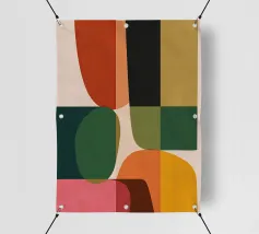 An abstract pop art motif with 70s charm shows colourful colour fields and patterns in orange-pink-green. The colourful structure meets modern, playful illustrations in graphic design. Lively and structured, with a clear, geometric aesthetic.