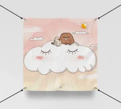 This artwork depicts a grumpy-looking cloud with a thought bubble containing a bird and a bear. The humorous and imaginative scene is set against a soft blue background.