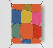 An abstract pop art motif with 70s charm shows colourful colour fields and patterns in orange-pink-green. The colourful structure meets modern, playful illustrations in graphic design. Lively and structured, with a clear, geometric aesthetic.