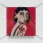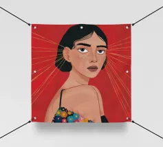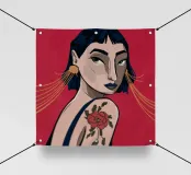 This painting depicts a person with a tattoo of a rose on their shoulder. The person is wearing large, golden earrings, and the background is a striking red, emphasizing the bold and expressive nature of the artwork.