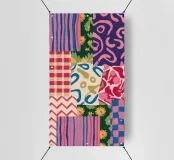 An abstract pattern combines patchwork-like color blocks with energetic scribbles and stripes, creating a dynamic, playful, and artistic design.