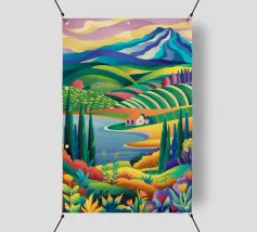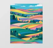 A beautiful landscape of rolling hills and fields, rendered in a colorful patchwork of greens, blues, pinks, and yellows, evoking a sense of idyllic countryside.