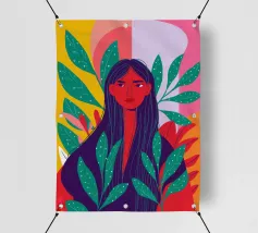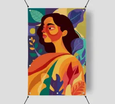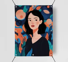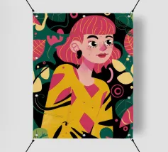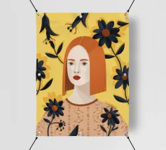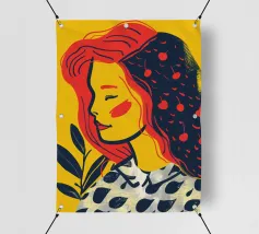 A portrait of a woman with flowing red hair, surrounded by stylized leaves and flowers, looking thoughtfully to the side. The style is modern, bold, and slightly art nouveau.