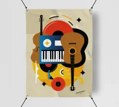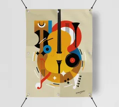 A modern abstract painting featuring geometric shapes forming guitars, violins, and musical notes in a bold, colorful composition. The textured background and dynamic arrangement evoke a sense of rhythm and artistic expression.