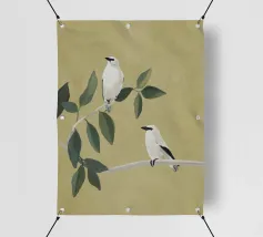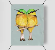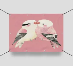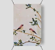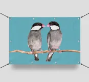 A watercolor drawing of two Java sparrows. They sit next to each other on a long stick and touch each other with the tips of their beaks.