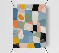 A vibrant abstract collage resembles a patchwork quilt, with different sections featuring varied textures, patterns, and colors, all stitched together in a harmonious and playful composition.